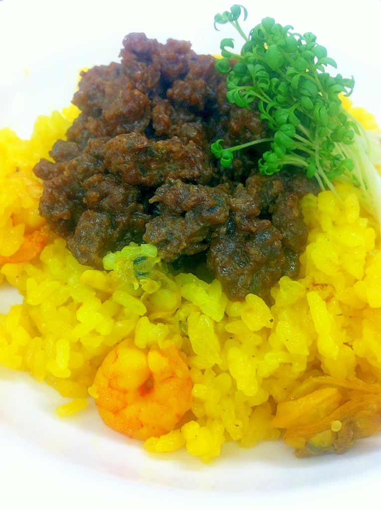 ちょっとパエリヤみったいに本格派ですが炊飯器でスイッチ押すだけ。シーフードからいいだしが出ます。写真はドライカレーのお供にしました。
