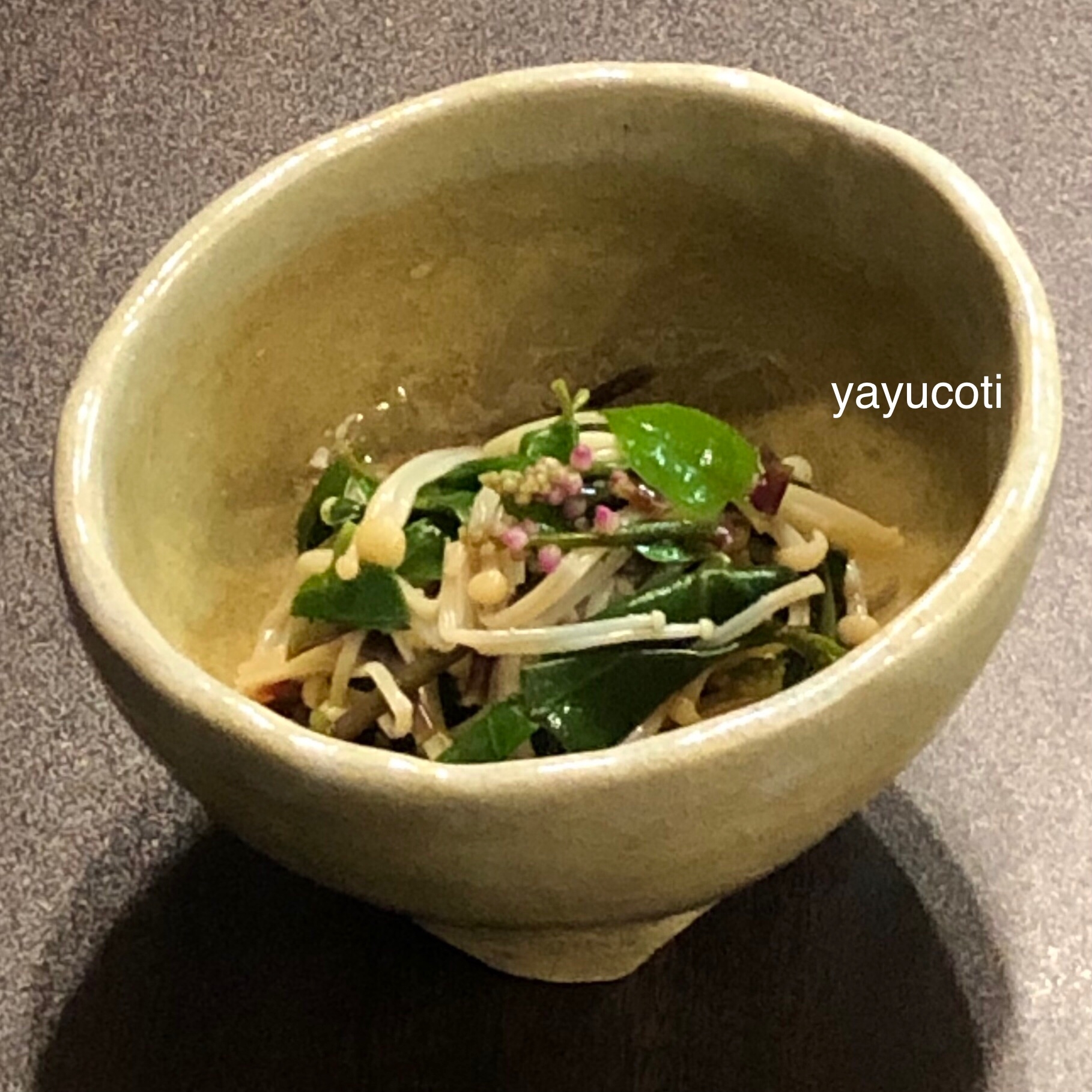 家庭菜園のつるむらさきで作りました。カルディで販売している「ホタテとしいたけのスープの素」が決めて