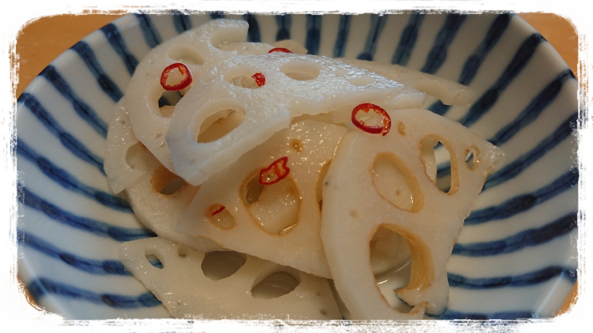 いわゆる酢ばす(酢れんこん・甘酢漬け)ですが、柚子果汁を足して爽やかにしました。柚子皮も加えて香り高く。