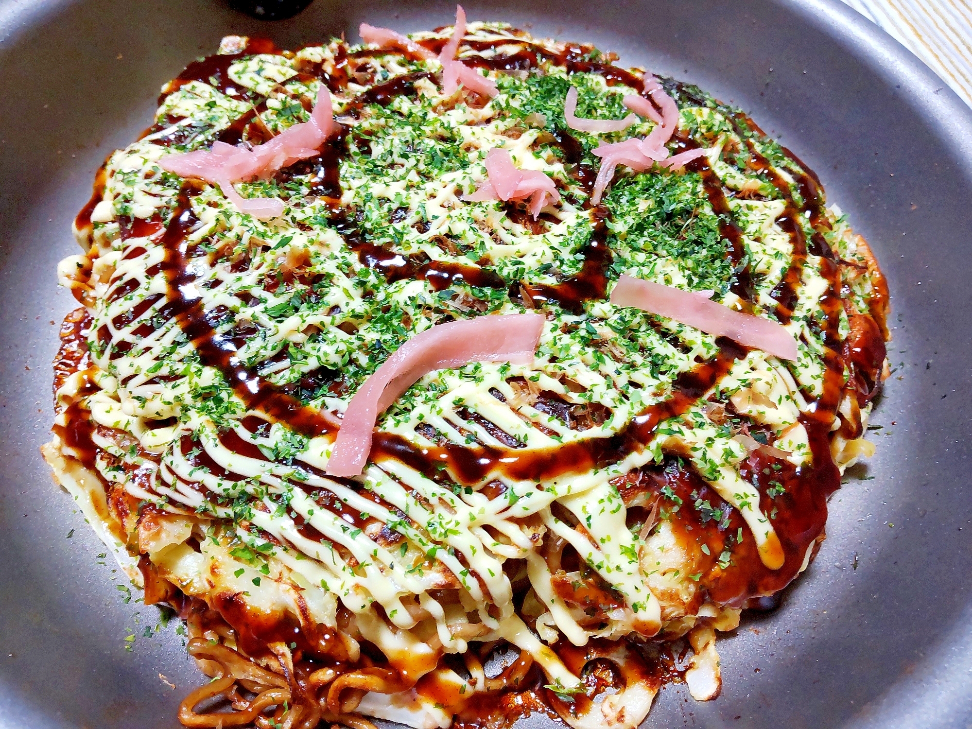 お好み焼き粉を天ぷら粉に変えて〜モダン焼きの焼きそばはインスタント焼きそばに変えて〜家にあるもので楽しむお好み焼き(^^) 焼きそば入るとモダン焼きです