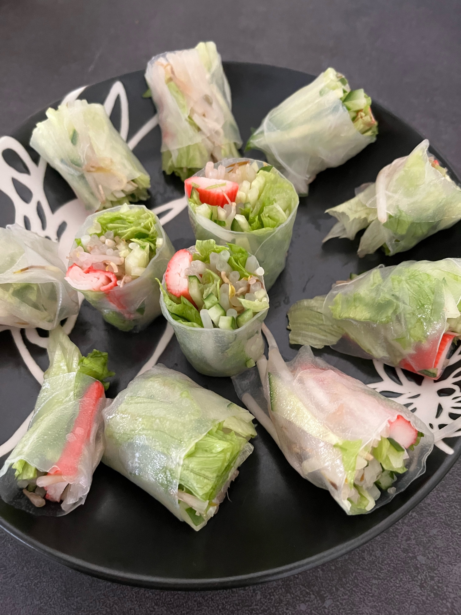 家にある野菜何でも大丈夫です。千切りにすると巻きやすい。サラダ感覚。
