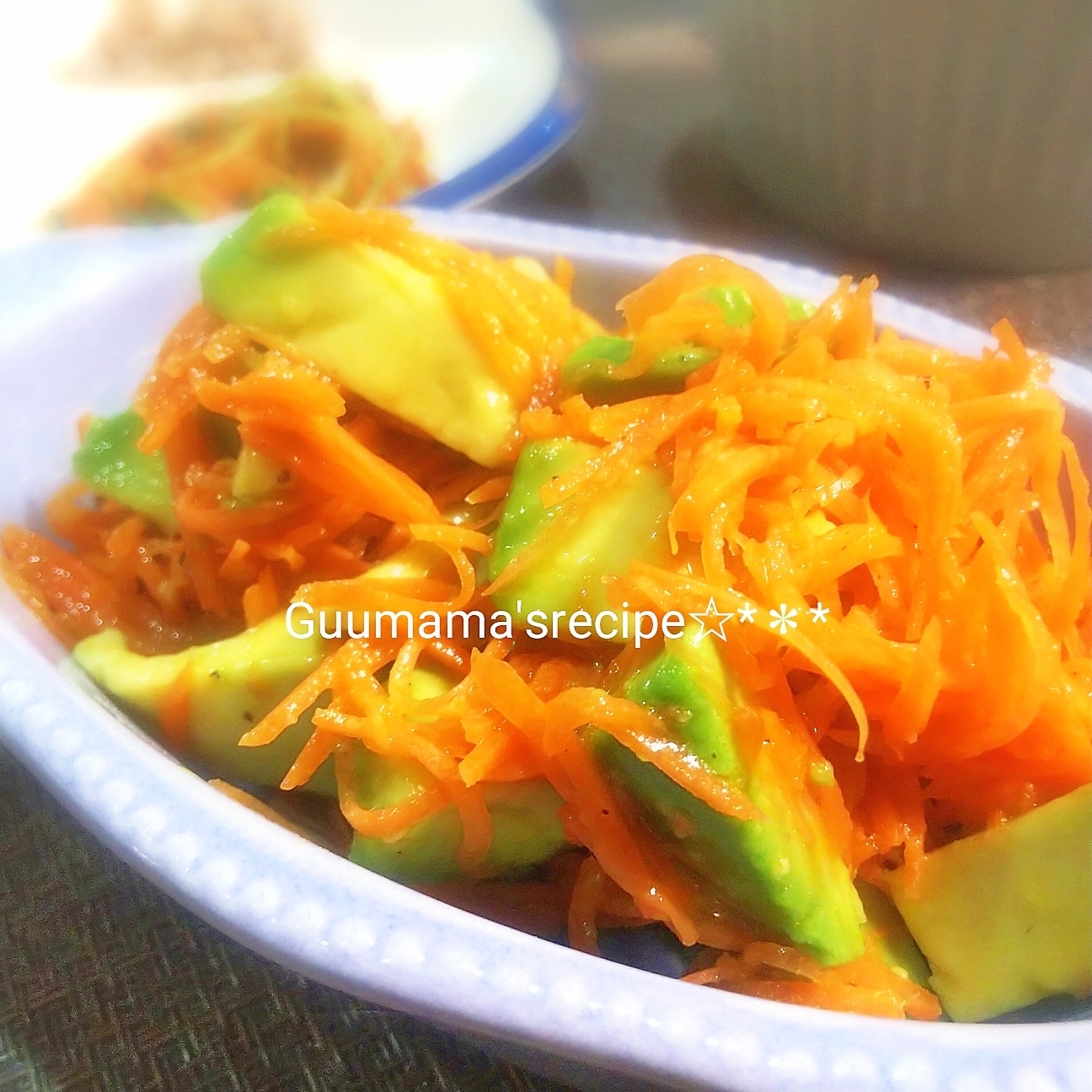 スライサーで千切りにしたにんじんとアボカドのサラダです♡レモンが効いたサッパリ味(*•̀ㅂ•́)و✧シャキシャキにんじんと柔らかアボカドの食感が楽しいᕷ*