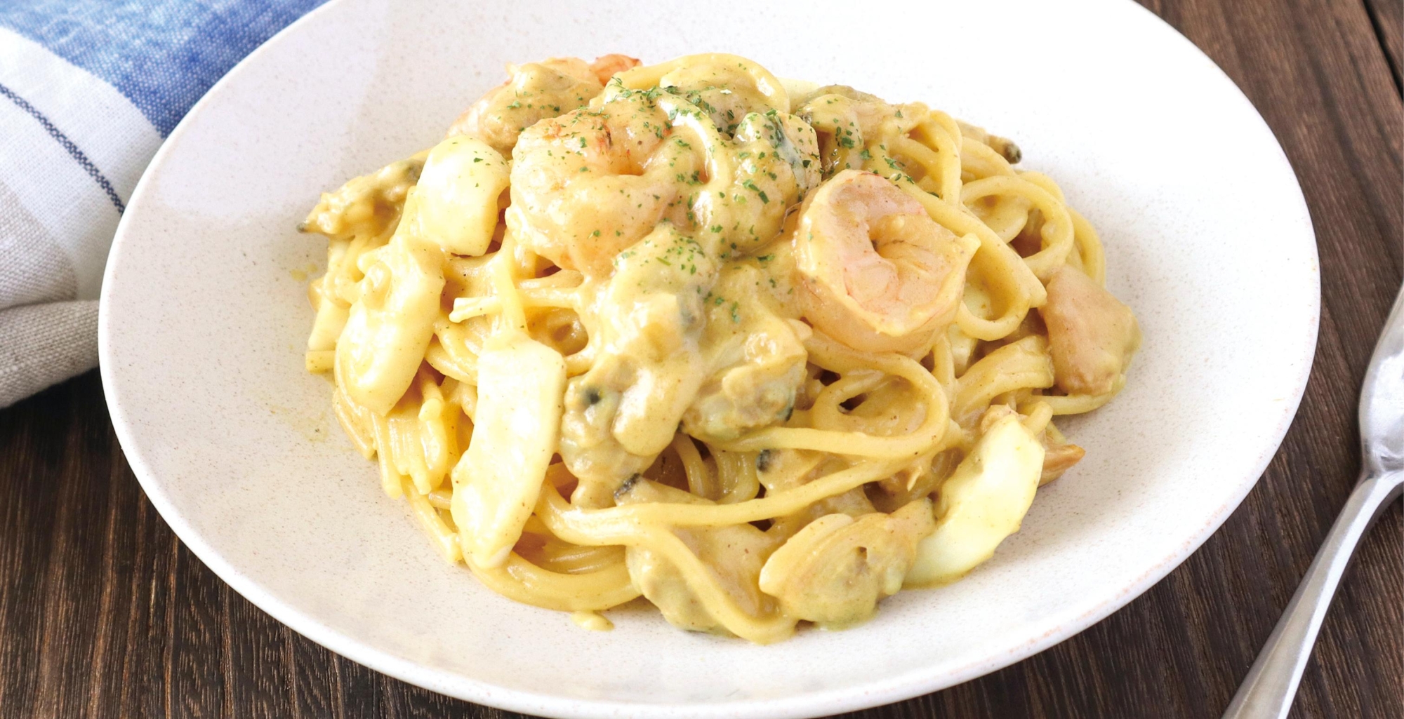 材料を入れて煮るだけでできるお手軽スピードメニュー、レモンの風味とシーフードが合う。