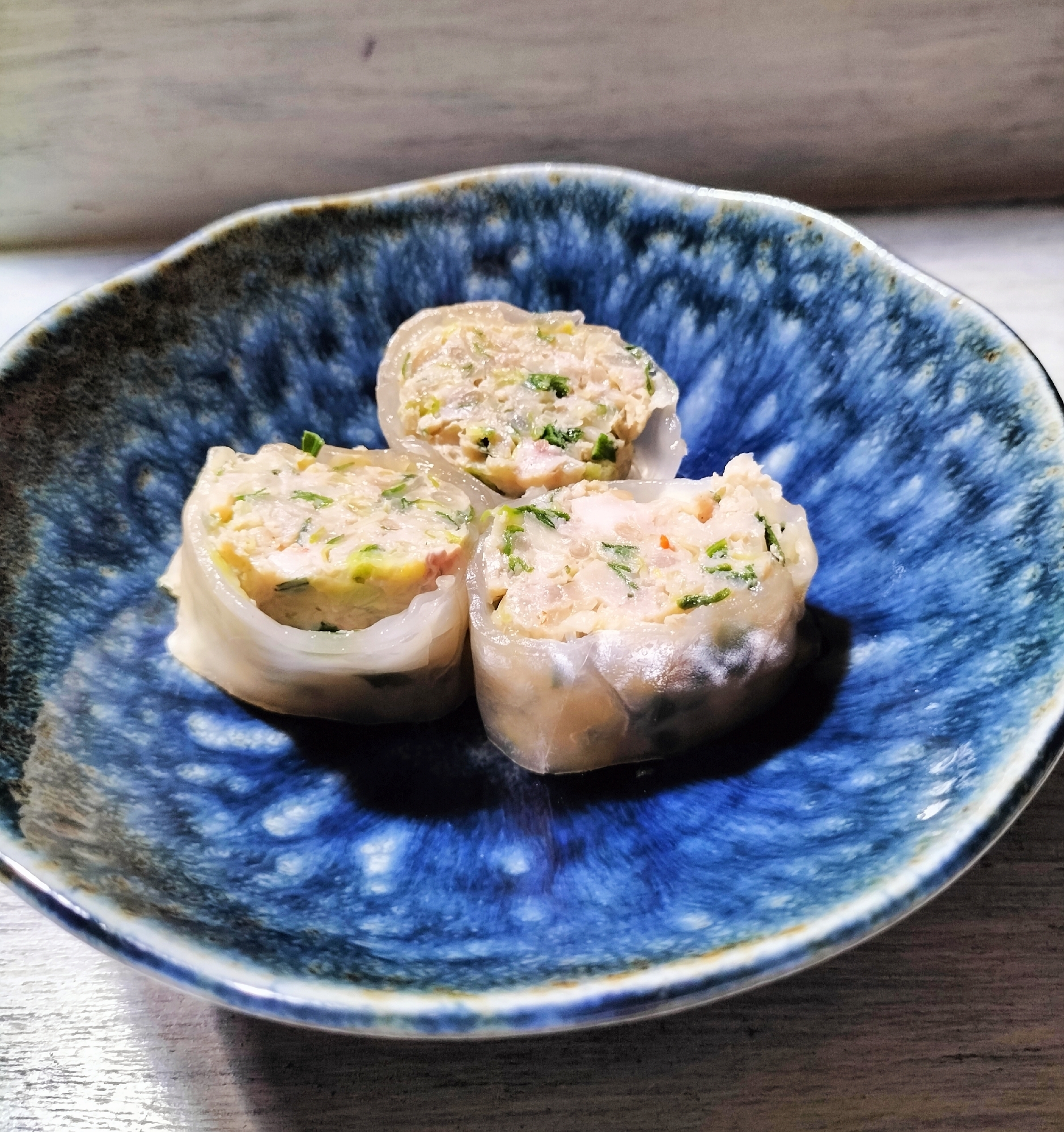 餃子の餡(タネ)を餃子の皮にあえて包まず...生春巻の皮で包んで焼きさらに生春巻の皮の独特の食感を楽しむために生春巻の皮を巻いたW巻きの餃子ですʘ‿ʘ