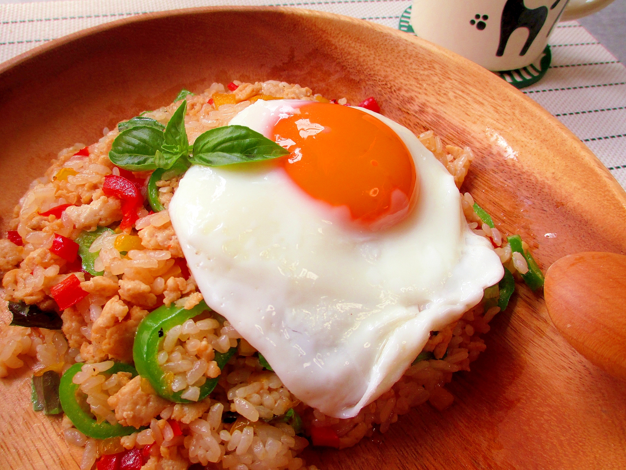 オイスターとナンプラーの旨味の中にバジルの香りが爽やかに広がる本格派の味♪青唐辛子のシャキシャキ歯ごたえが心地良い☆目玉焼きは半熟のとろ~りで!!