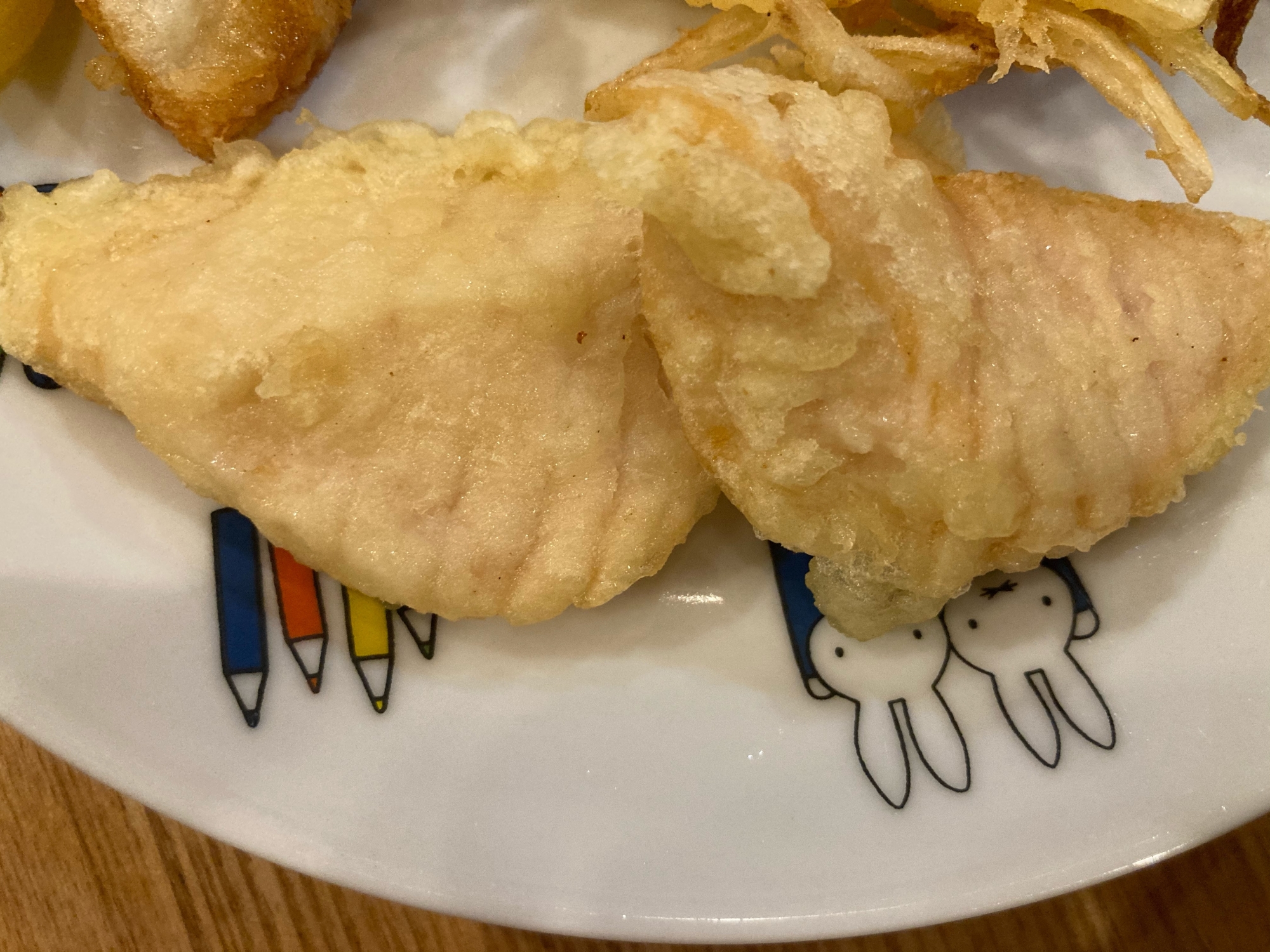 強力粉を使うことで、イカの皮をむかなく揚げてもはねないイカフライです。