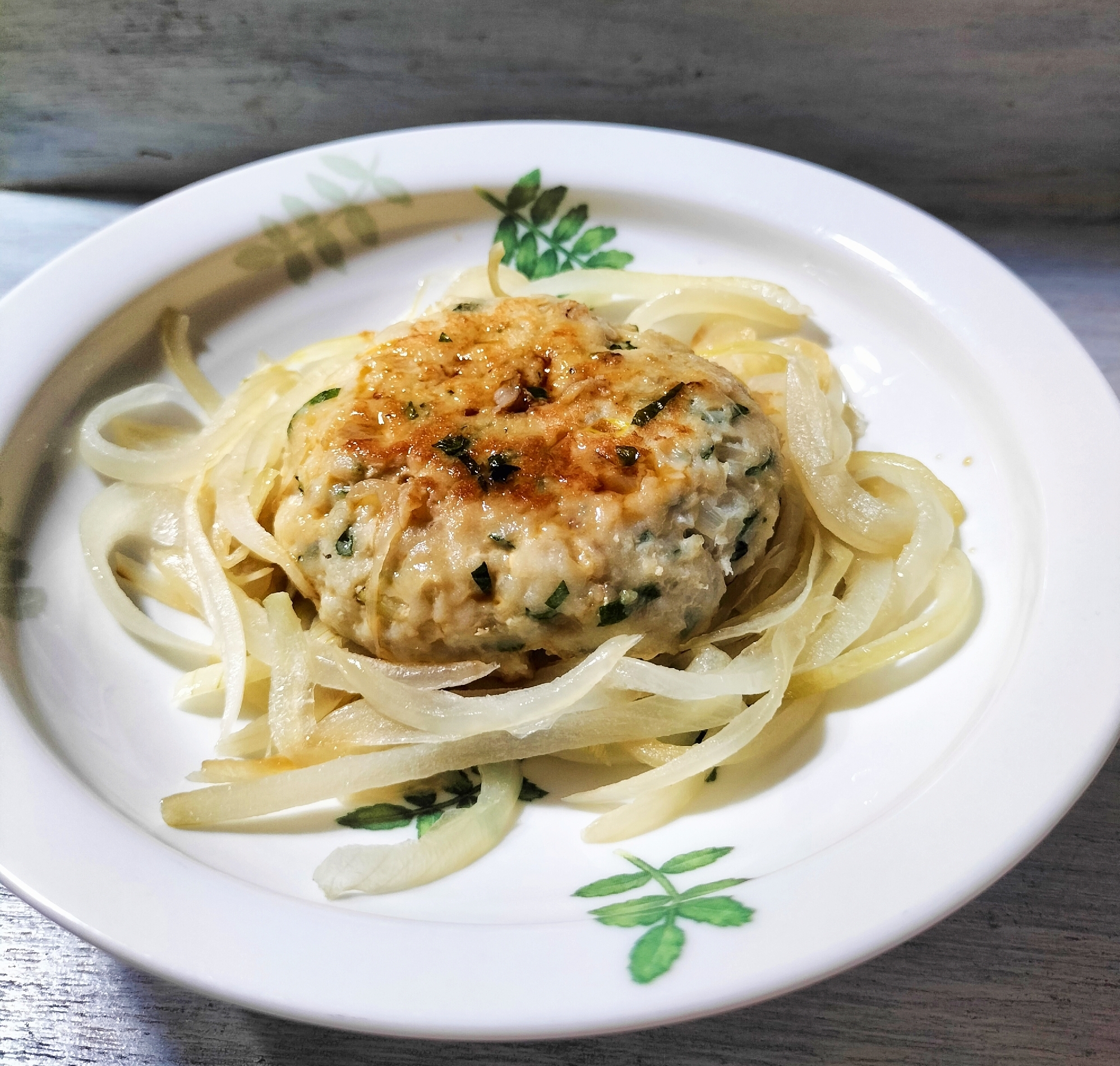 ハンバーグのたねにうずらの卵を中に入れて揚げたスコッチエッグです。