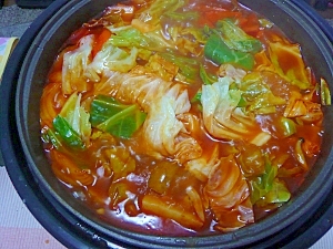 豚薄切り肉とじゃがいもと白菜と玉ねぎを具材に入れて 市販のトマト鍋スープで煮込んでとろけるスライスチーズを入れて煮たもの