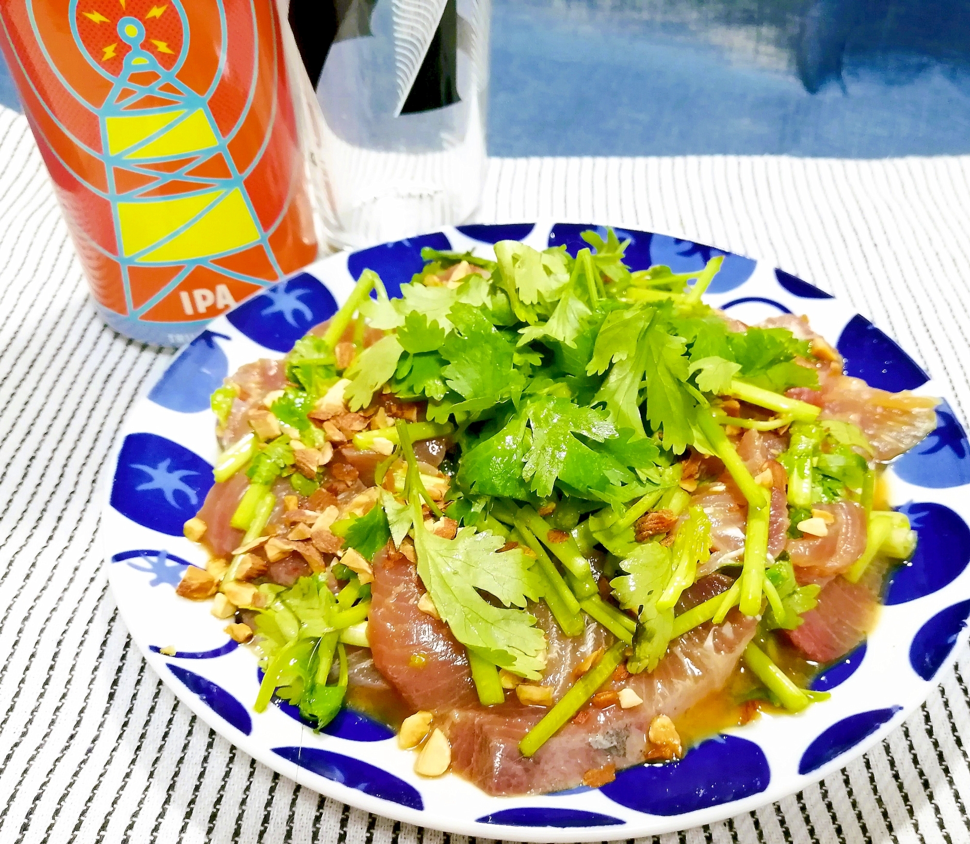 西海岸の風が感じられるようなクリーンでバランスのよいアメリカンIPAに、お刺身のぶりとふんだんのパクチーを組み合わせたアジアン風サラダをペアリング。
