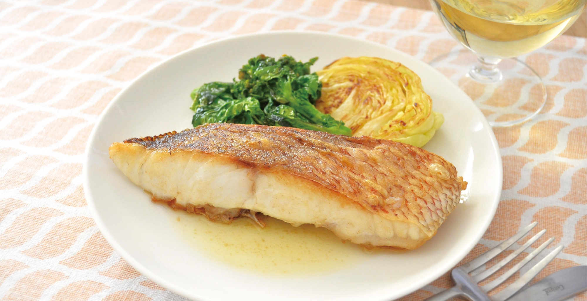 皮をカリッと焼いた鯛に、レモン風味のバターソースがよく合います。春野菜もソテーして一緒に。