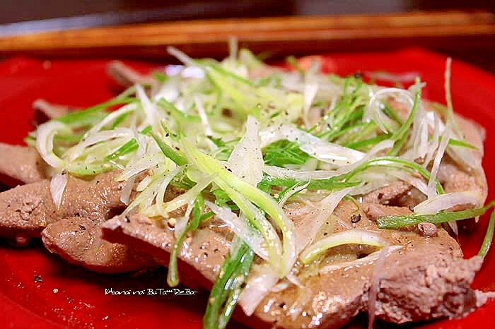 酒蒸ししたレバーと葱に、熱いごま油をかけます