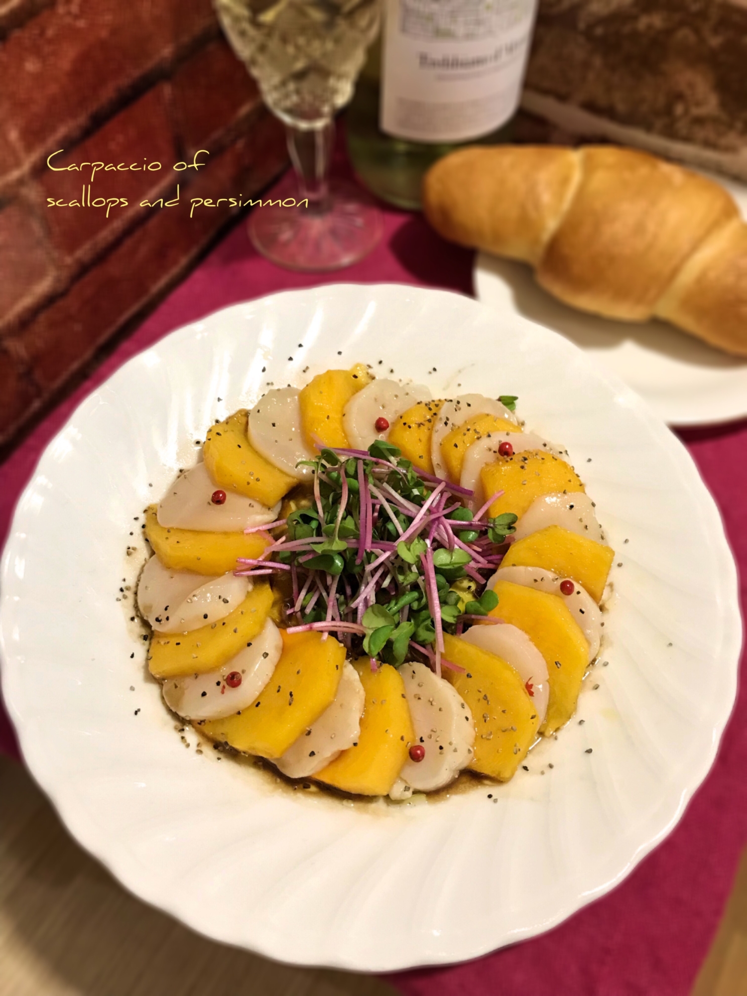 お刺身が美味しい帆立貝柱ですが、カルパッチョも是非お試しあれ。今回は貝柱の旨味が引き立つオレンジ風味のカルパッチョソースで、旬の柿と一緒にいただきます。