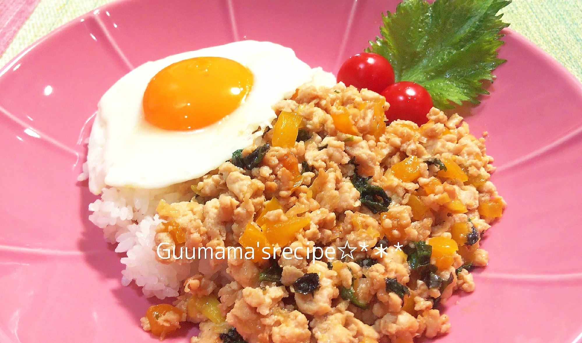 ナンプラーもバジルも使いません!普段使いの調味料で簡単にできちゃうのにとっても美味しいんです(๑><๑)۶大葉たっぷりの和風ガパオライスです♡