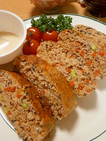 ごまの香りが香ばしい☆ひじきや枝豆も入った和風のミートローフです。ポン酢マヨでいただきます☆