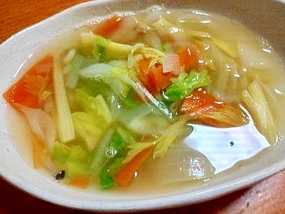 玉ねぎと人参がたっぷり入ったコンソメスープです♪キャベツやささみなど具材を変えて楽しめます!